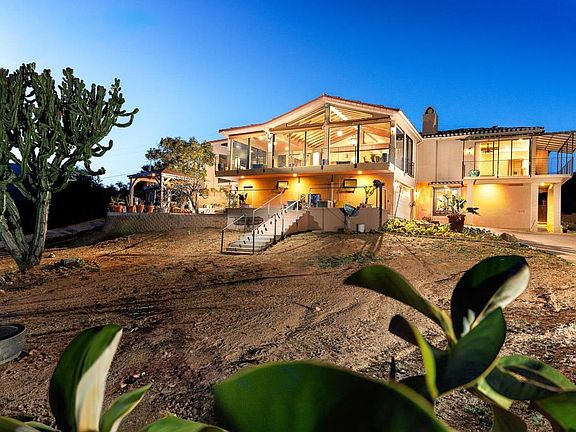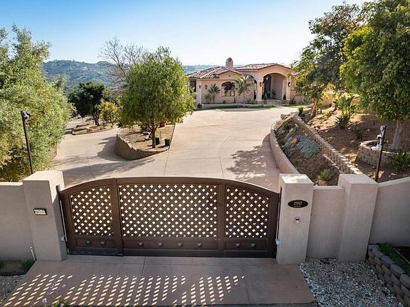 Step into a world where elegance meets unparalleled luxury, nestled in the tranquil enclave of Valley Center. Your journey begins as you pass through the double electric gates, unveiling an estate that promises sophistication and comfort. As you enter through double massive glass and Iron doors and grand foyer, you're greeted by vaulted ceilings adorned with skylights, casting a natural glow on the solid cherry hardwood floors. The inviting ambiance is further enhanced by crown molding and solid wood doors, setting the tone for the opulence that lies ahead. Imagine starting your day in the gourmet kitchen, a haven for culinary enthusiasts. Equipped with an 8-burner 48" Wolf stovetop and Wolf double oven/warmer, this kitchen is designed for the modern chef. The butler pantry, complete with a copper sink, prep area, and coffee bar, ensures every meal is a masterpiece. As you move through the space, the whole-house vacuum system makes maintaining the pristine condition of your home effortless. Adjacent to the kitchen, the elegant dining area boasts 9' double pane windows, offering breathtaking views of Hidden Meadows. Here, you'll host gatherings around the wood-burning fireplace with gas logs, creating memories that will last a lifetime. For those who love to entertain, the home features a wet bar with a sink and a secret bar server, perfect for intimate soirées. As the evening progresses, retreat to the indoor saltwater pool area. This serene oasis, complete with a view deck, lounging area, bathroom, and skylights, promises relaxation and tranquility. The estate's commitment to sustainability shines through with paid solar for both the pool and house, powered by 40 solar panels. Step outside of your living area that features a retractable glass wall that opens to the large, enclosed 1075 sq ft view deck with vaulted ceilings and wall-to-wall windows, an entertainer's paradise. With a balcony, BBQ island, 3 auto shades, and large sliders, it's the perfect spot for alfresco dining or simply soaking in the stunning scenery. The Santa Barbara finish inside and out, complemented by a clay roof and rain gutters, adds to the estate's timeless beauty. The master suite is a sanctuary of luxury, featuring two large sliders, dual sinks, dual shower heads with a rain head, and a walk-in closet with built-ins. Wake up to breathtaking views and unwind in the comfort of your private haven. Additional bedrooms offer walk-in closets with built-ins, a Jack and Jill bathroom, and a guest bath illuminated by solar tubes. Practicality meets luxury with a 4-car tandem garage equipped with a 240 electric car charger and a Generex generator. The laundry room is thoughtfully designed with a sink, broom/mop storage, folding table, and wrapping table, ensuring all your needs are met. Two water heaters and zoned AC ensure comfort throughout the year. Venture into the basement, where endless possibilities await. A pool room, wine cellar, and gym cater to all your lifestyle needs. The estate's orchard, boasting 18 trees including citrus, apricot, avocados, fig, cherimoya, loquat, oaks, and 30 olive trees, offers a taste of nature's bounty. This Valley Center estate is more than a home; it's a story waiting to be written. Experience luxury living at its finest, where every detail is crafted to perfection. Welcome to your forever home. Beautifully Remodeled throughout.