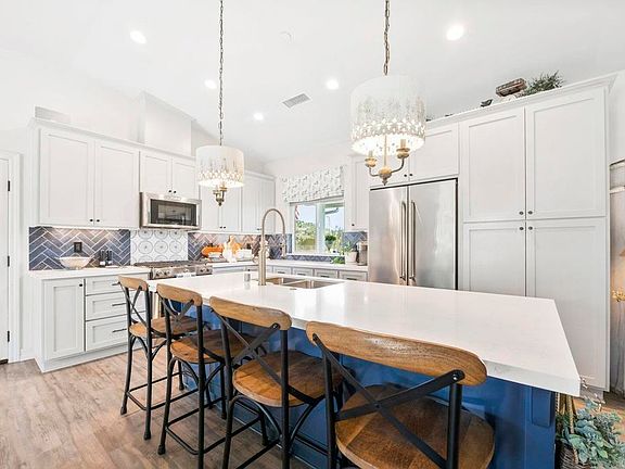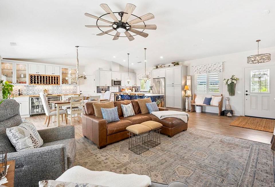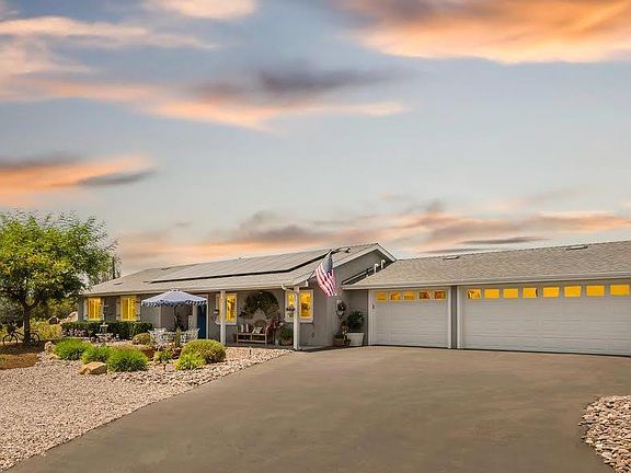Welcome to this stunning custom-built modern farmhouse with owned solar situated on an all usable 2.18-acre lot. This one-of-a-kind home is a true showcase of craftsmanship and thoughtful design, where top-quality construction meets timeless elegance and energy-smart living. The open-concept living spaces feel both fresh and luxurious. Custom cabinetry, handmade locally, features soft-close doors, self-closing drawers, under-counter lighting, and even a handcrafted wine rack that can be reconfigured to fit your needs. The gourmet kitchen is equipped with quartz counters, custom backsplash, and a full suite of matching top-tier KitchenAid appliances. At the heart of the space, an oversized island with bar seating invites gathering and conversation. For the ultimate in entertaining, a dedicated drink station features dual wine and beverage refrigerators, a butcher block countertop, and a convenient sink—perfect for hosting in style. Durable vinyl plank flooring flows seamlessly through the main living areas, while brand-new commercial-grade carpet provides comfort in the bedrooms. The spacious primary suite includes a beautiful ensuite bath and large walk-in closet. The outdoors is equally impressive: a fully fenced backyard with low-maintenance vinyl fencing, perfect for pets and play. Fruit trees—including fig, avocado, orange, lemon, and lime—offer fresh bounty year-round. The large, flat, graded lot offers endless potential—whether you envision an ADU, a barn, a pool, or a horse corral, there's room to make it your own. This home is as smart as it is stylish. Sustainability features abound, including an owned solar photovoltaic system with excess capacity, enhanced insulation, energy-efficient windows, LED lighting, high-efficiency HVAC, a whole-house fan, and a tankless water heater. Together, these features contribute to zero SDG&E electrical bills. Smart home automation includes remote control of the Hunter Hydrawise irrigation system, thermostat, solar monitoring, and exterior lighting. Practical amenities include a 3-car garage with Gladiator storage cabinets, a stainless Whirlpool garage fridge, an LG washer and dryer, and wiring for a backup generator. There's also dedicated RV parking right beside the garage. In addition to the extra-thick exterior walls and high-end finishes throughout, the exterior of the home is wrapped in fire-resistant stucco, complemented by a full fire sprinkler system and a fire hydrant right on the property line offering exceptional durability, insulation, and peace of mind.
