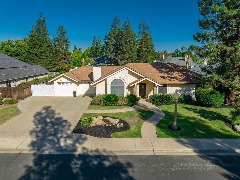 This lovely 4 bedroom/2 bath custom home in a highly desirable neighborhood in Clovis inclues: Large lot (over 13,000 sq. ft), RV Parking, Shop, Pool and spa! Home boasts newer luxury vinyle flooring throughout the entire home and shutters on front windows. Upon entering the home, buyers will be enticed by the open floor plan that flows from the spacious living area to casual dining area and kitchen that has stainless steel appliances, granite countertops, breakfast bar, and lovely view of the amazing backyard! The primary bathroom was compeltely remodeled with new shower, countertops, sinks, and custom closet. Backyard is an entertainers delight all year long with custom designed pebble tech L-shaped pool and spa, 3 white lounge ledgers, swim up built-in bar stools, water falls, and two fountains, large shelf and spacious spa that flows into the pool. The property has a insulated steel framed shop and there is also RV driveway, gate, and parking. Do not delay...come see this house today!