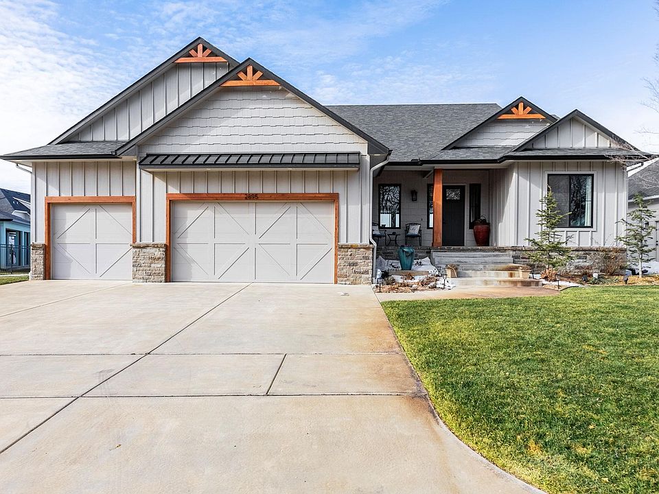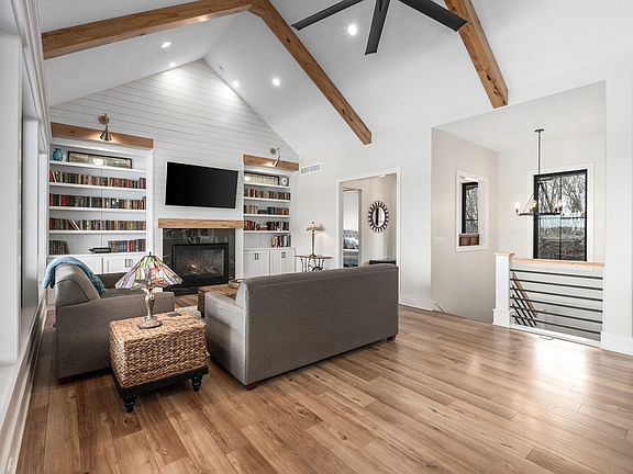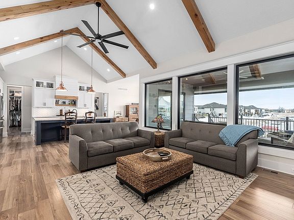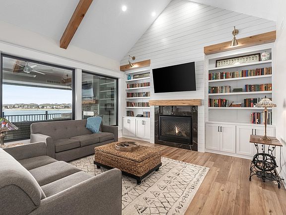 Lakefront living at its best! This gorgeous Sandcrest home with gleaming wood floors, soaring vaulted ceilings, and impressive wood beams is timeless and will impress the most sophisticated buyer. Inside you'll be greeted by the sprawling vaulted great room, featuring a gas fireplace with charming built-ins, and large windows facing the water. The gourmet kitchen is open, spacious and filled with storage - the perfect place to cook while you entertain. Thoughtful details like copper lighting, wood accents and a unique walk-in pantry make it a dream space. The adjacent dining nook features stunning water views and opens to a large covered deck. In the primary bedroom, water views are complimented by a vaulted ceiling with wood beams. The primary bathroom features double sinks, a tiled shower and an oversized walk-in closet. The closet adjoins the laundry room for added convenience. The main floor is completed by a sunny front bedroom with a large closet, plenty of light, and attached full bath. Enjoy the covered deck in all seasons, as it features a gas fireplace, electric heaters, automatic sunshade and a custom wood paneled ceiling. The walk-out basement is the perfect place to relax, play games or host friends and family, and boasts easy outdoor access with a wide sliding door. Its generous layout includes a fireplace, custom built-in bar, and plenty of space for hosting. Two bedrooms and a full bath complete the basement. Spend evenings on the lower deck enjoying the large hot tub with lake views, as it remains with the home. Located in one of Wichita's premiere lake communities, Sandcrest, this lake community not only accommodates water-skiing, jet skiing, and pontoon boating, along with all the other non-motorized lake activities, it also boasts a large clubhouse, pickle ball court, playground, and two area swimming pools. This picturesque home is conveniently located close to top schools, shopping and dining. Plus enjoy a sandy beach with built in stone fire pit, and private dock right out your own back door (the dock is included with the property). This gorgeous lakefront home is ready for all the summer fun!