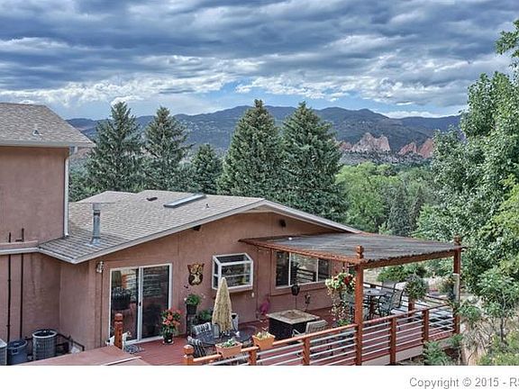 Grand one of a kind, meticulously maintained home with breathtaking views of both Pikes Peak and Garden of the Gods from it's 4 oversized decks! There are so many special features you need to come see for yourself. As you enter into the heart of the home you see a large open living room with a fireplace and a entertainment center with a walk-out to a 8'x30' deck that overlooks both Pikes Peak and Garden of the Gods, this flows into the dining room and kitchen, that features two pantries, granite counter tops, gas stove, this all leads out to a massive 13x30 deck with a 20x20 decorative concrete pad attached, featuring hot-tub. Main floor also has two bedrooms one could be a second master suite with it's own bathroom with a jetted tub, marble counter top and a walk-out deck, all decks are composit decks. Master suite is upstairs it is 840 sq. ft., it features two walk-in closets, one with it's own washer/dryer, 2 sinks marble counter tops, jetted tub, the grotto styled shower has 9 shower heads, two seating areas, and a steamer, it also boast it's own walk out deck that has it's own heater and A/C.the garden level has a family room with a great bar with granite tops and entertainment center , 1/2 bath with a custom vanity, another bedroom with it's own bathroom and shower. The 2 garage is oversized with it's own work area. The house sits at the end of a dead end street. The yard is quite and serene. With it's stunning views and custom touches throughout this home won't last!! Listing Agent: Edward H. Company: RE/MAX Properties, Inc. Phone: 719-640-0295 Email: ed.reilly@wesellmore.net