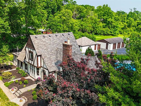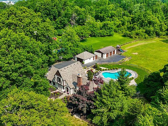 This classic English Tudor sits on 2.4 private acres, offering a comfortable estate-style setting in a prime location across from Amberley Green. Inside, the home features random-width hardwood floors, cathedral ceilings, arched doorways, and thoughtful architectural details throughout. The first-floor primary suites adds convenience and flexibility. Outdoor living is just as inviting, with a screened-in porch, a custom heated saltwater pool, and professionally landscaped grounds creating a peaceful retreat. An oversized five-car garage provides ample storage and functionality. Move-in ready and well cared for, this home is a wonderful opportunity in a highly desirable setting.