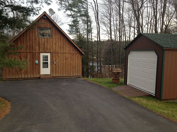 Well maintained 1 1/2 story home with lake frontage - 3 BR including loft, eat-in kitchen, 3/4 bath w/ washer / dryer hookup, full walkout basement and front deck w/ beautiful lake view. FHA heat w/ newer hot water heater, municipal sewer and drilled well. 1 Car detached garage with electric opener and paved circular drive. Gorgeous open and hemlock shaded setting. Annual Lake Association fee $140.00.