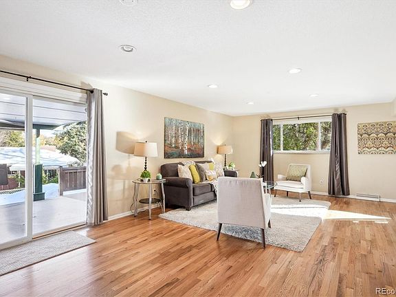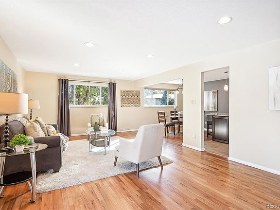 Discover this beautiful 5-bedroom, 3-bathroom single-family home, perfectly situated on a spacious corner lot with a meticulously maintained yard and mature trees. Step inside to an open floor plan, highlighted by hardwood floors throughout the main level. The inviting kitchen boasts a large granite island with breakfast bar seating, soft-close cabinets, and ample storage, flowing seamlessly into the dining and living areas for effortless entertaining and family gatherings. The main floor includes three generously sized bedrooms, including the primary suite, which offers two closets, two large windows, and an ensuite bathroom. Downstairs, the finished basement serves as an ideal flex space, featuring a built-in wine bar, two additional bedrooms with large closets, and a shared full bathroom. Outside, the backyard is a serene retreat. A covered patio with a ceiling fan and privacy blinds leads to a custom Trex deck and an expansive seating area. Enjoy the lush lawn and the convenience of a custom-built storage shed. This home is centrally located, just minutes from The Streets at SouthGlenn, I-25, parks, and scenic walking trails, this home offers a perfect blend of tranquility and accessibility.