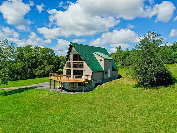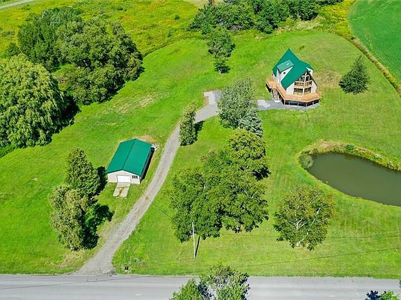 Modern chalet with rustic charm located on a hillside near Skaneateles Lake. Newly renovated, it sits on a spacious 2 1/2 acres. Fifteen minutes from charming Downtown Skaneateles, it affords access to local amenities, with the benefit of rural seclusion. The interior is graced with woodwork crafted by a local carpenter, integrated within the home's doors, molding, trim, stairs, railings and baseboards. Flooring throughout the house is imported European oak. Make your way up the custom live edge dark walnut stairs and enter the master suite's living space, overlooking the family room, leading into the master bedroom and spacious master bath. Enjoy the reading loft perched facing the front windows making a relaxing space, amidst the backdrop of a breathtaking sunset vista. The first floor, with 2 generous bedrooms, full bath, family room and kitchen, leads out to a large deck overlooking a pond that serves as a calming forefront to this magnificent landscape. Newly installed French doors lead into a spacious unfinished basement, which if completed could provide over 1000 sq feet of additional finished living space. It has a large detached garage at the driveway entrance.