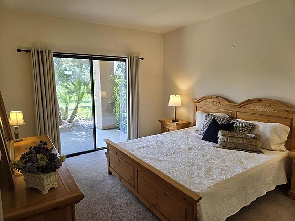 Beautifully maintained, pristine condo with gas fire place, beautifully landscaped for privacy! West facing view of mountains and Vista 1 fairway, you will enjoy this private patio. Updated kitchen, tile except for bedroom. Tommy Bahama furnishings! Brand new king mattress in master bedroom. Lovely front entry gates make a great first impression on this nice end unit condo. One car detached garage. Land lease extended to 2069 (a $10,000 savings!). Monthly ground rent $152.88.HOA DUES INCLUDE: 2 DVR or HD Cable boxes and service, High Speed Internet, grounds maintained to your door by HOA ground maintenance crew, outside pest control when requested, outside water, (you pay only for inside water). Gated community with 24 hour guard gate access, membership to Health and Fitness Center, Tennis, Bocce Ball, Pickleball. The Desert Princess has an affordable 27-hole PGA Championship golf course, no Tee-time lotteries, no initiation fees, rated among the best in the valley by GOLF DIGEST. This quiet community is away from the noise yet minutes from everything that is in Palm Springs; restaurants, shopping, casinos, an international airport, the Tramway, Art Museum, Theaters, and the Street Fair.
