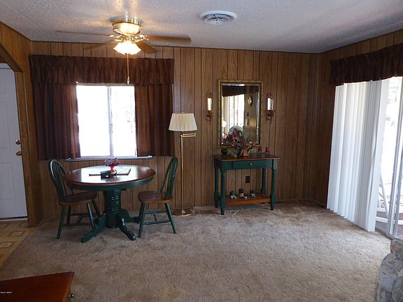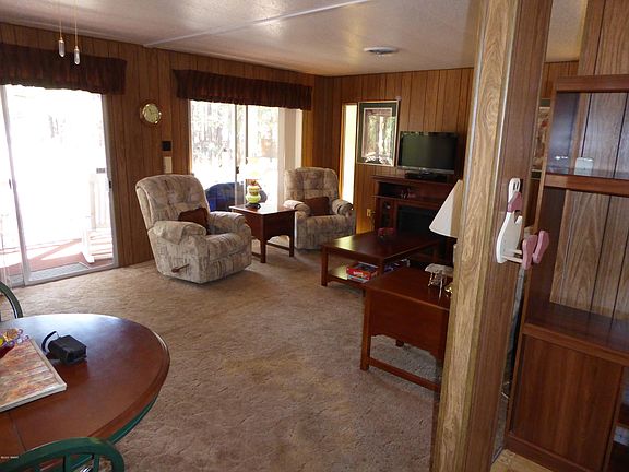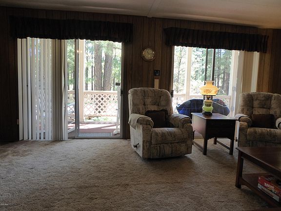 Nice double wide manufactured home nestled on a beautiful treed lot. Enjoy the Ponderosa pines in the front yard from the covered deck. This is a great ''pack & play home,enjoy all the out door spaces. The electric fire place in the living room has only been used one season. This home is move in ready and the furniture stays with the property. It has a chain link fence wrapping around the backyard with storage/workshop at back of property. Home is covered with home warranty which is transferable. The sellers will pay to extend the warranty for one year or buyers choice. not to exceed $500,00