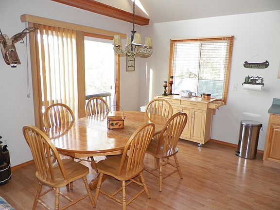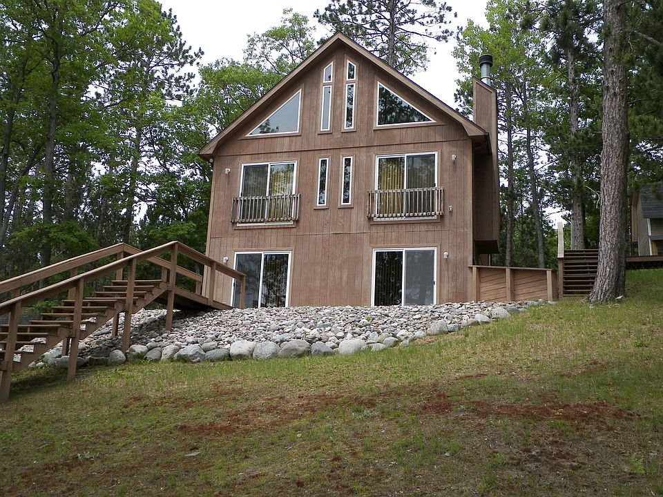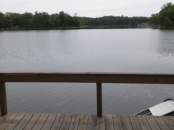60' sandy bottom waterfront cottage on 89.5 acre no-wake Crooked Lake. Beautiful views from great room, loft and walk-out basement. Wood burning fireplace to take off the chill. Full unfinished basement has plumbing for additional bath and laundry. Property has room for a garage. Deck at lakeside. Dock included with purchase.