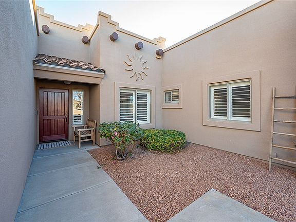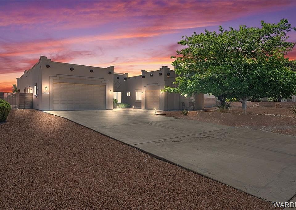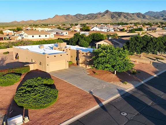 This stunning Santa Fe-style custom home in Rancho Santa Fe was designed to showcase its surroundings. From the living room, dining area, and primary suite, you'll enjoy uninterrupted views of the Hualapai Mountains, filling each space with natural beauty and light. Offering 3 bedrooms, 2 bathrooms, plus a versatile bonus room with a walk-in closet (ideal as an office, den, or 4th bedroom), this 1,943 sq ft residence blends thoughtful design with everyday comfort. The primary suite is a retreat of its own, featuring patio access, a jetted tub, a separate shower, and spacious walk-in closet, all with those same serene mountain views as your backdrop. The inviting living and dining spaces center around a Kiva-inspired fireplace and custom southwest cabinetry with intricate inlay details. Large sliding doors, complete with motorized shades, connect seamlessly to the expansive rear patio, perfect for entertaining or quiet evenings. With two garages (a 2-car and a 1-car, both finished with epoxy floors), custom shutters throughout, and a .46-acre lot with desert landscaping, RV parking, and room for a pool, this home is a true desert oasis designed for the Arizona lifestyle.