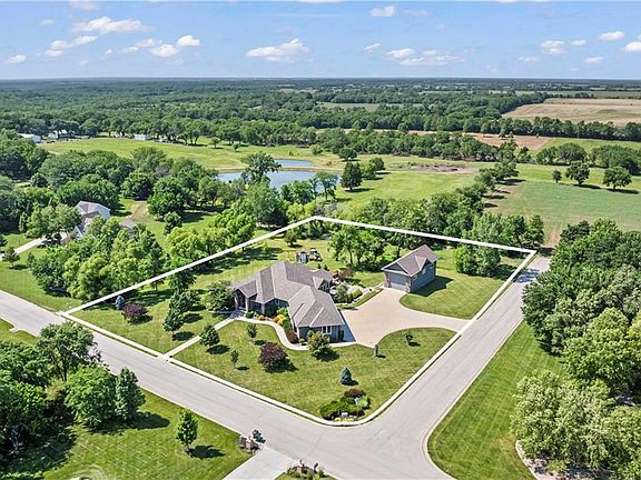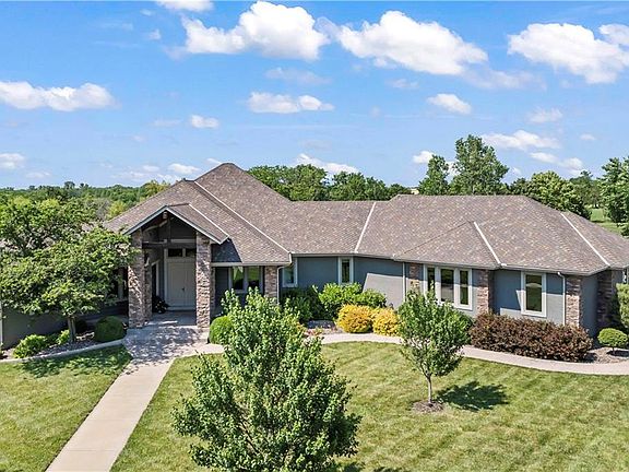 You will love the beauty and functionality of this custom-built home! This exquisite estate offers a perfect blend of privacy and accessibility-located on a serene 2-acre lot, yet close to shopping, dining and highway access. The heart of the home is the gourmet kitchen, boasting a generous island, expansive walk-in pantry with a convenient grocery door from the garage, and an attached private office. Both formal dining and spacious eat-in kitchen area are offered. The great room features a stone fireplace with matching stone archway and gorgeous views of the backyard. Retreat to the primary suite, featuring a luxurious walk-in shower, freestanding copper tub and spacious closet that flows into the laundry room. Step out onto the screened porch from either the primary bedroom or the kitchen. The main floor has a second full bathroom and bedroom, perfect for an office. The walk-out basement offers two additional bedrooms connected by a Jack & Jill bath, accompanied by a half bath for added convenience. The expansive family room area is an entertainer's dream, boasting a magnificent stone and granite bar, a wine room, a cozy fireplace, and ample space for hosting guests. Adjacent to the bedrooms, discover an exercise room and sauna, offering a haven for relaxation and rejuvenation. The lower level seamlessly transitions to the dramatic outdoor entertainment area, featuring a plethora of amenities. The pergola covered patio is a true oasis, boasting a fireplace, pizza oven, fire pit, and hot tub. Enjoy the charming pond and space for activities. This property also includes a 52’x32’ outbuilding with an unfinished loft, offering endless possibilities for customization.