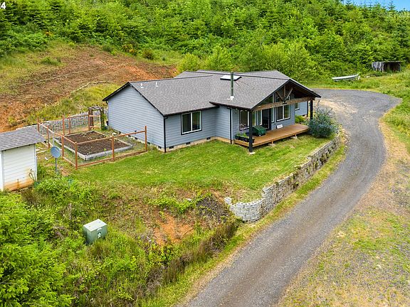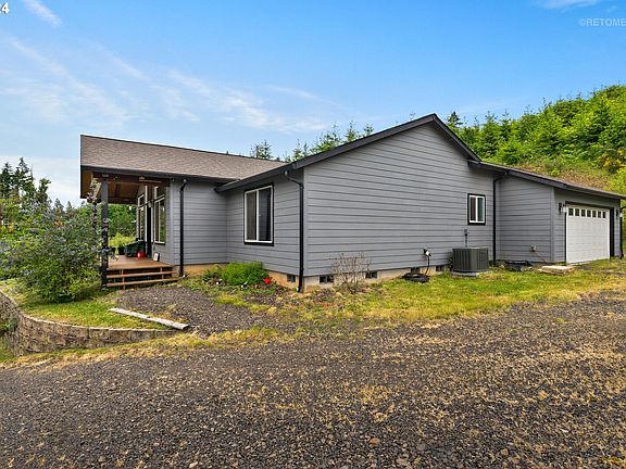 1852 sq ft 3 bed 2 bath single level home built in 2018 in rural Gaston on 32.85 peaceful acres surrounded by future marketable timber. Primary ensuite bedroom with walk in closet and stand up shower situated on opposite end of home from 2nd and 3rd bedrooms. Open concept floor plan with vaulted ceilings, skylights, eating bar, dining with slider to back patio and wood stove. Expansive breathtaking territorial views from covered front porch and large front windows. Fenced garden area, French drain system, well house with 200? deep well that produces approximately 29 gpm. Creek accessible on lower section of the property. Property has 2 tax lots with power accessible at 2nd tax lot. Buyer to do due diligence on buildability of 2nd tax lot.
