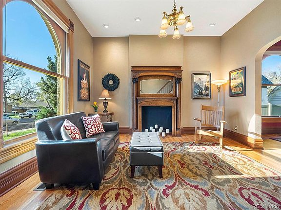 The delightful antique mantle in the cozy living room brings a touch of sophistication. And the charming details of the stained-glass window, reproduction wood trim, hardwood floors, original staircase, oversized arched front window making this the ideal place to unwind after a long, tiring day. The expansive sunlit kitchen is an epicure delight, perfect for casual dining or entertaining guests with access to the private fenced backyard (sprinkler system) and patio. And the convenience of an attached mudroom and laundry right off the kitchen.The coveted carriage house/garage is the perfect place to store your car and with additional easy access (pull-down stairs) attic storage. Plus the addition of 3 paved parking spaces. Indulge in the charms of this neighborhood, dotted with local parks (the Richardson-Hart Park is at the end of the block), brew pubs, grocery, coffee shops, the Edgewater Public Market, and Sloan’s Lake Park are a stone’s throw away. Easy access to Downtown Denver, the Highlands and Tennyson neighborhoods. Do not miss a golden opportunity to own this unique historical masterpiece. Come and experience the grandeur of this lovingly restored Victorian home that will transport you to a bygone era.