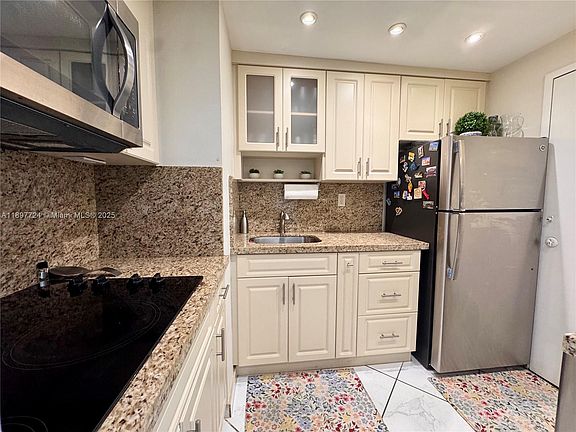 Granite countertopsPorcelain tile floorsGlass-enclosed showerStainless steel appliancesThree closets