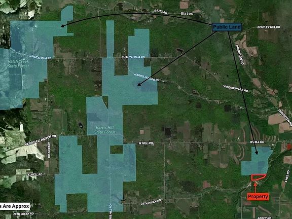 The land is mostly wooded with an open building site located right off the road. The property includes an established driveway and a parking area. The woods are mostly hardwoods with some pine trees. There is an ATV path that runs the entire length of the property. Electric is located at the road with 1,850 feet of road frontage. There are multiple creeks running through the property. The north side of the property is bordered by 159 acres of public land that you can hunt, hike and explore. There are also two other state forests within a few minutes drive that are public as well. Great location to build a nice cabin or home. The property is located in the Falconer School District. The annual taxes are $621.96. All rights convey.