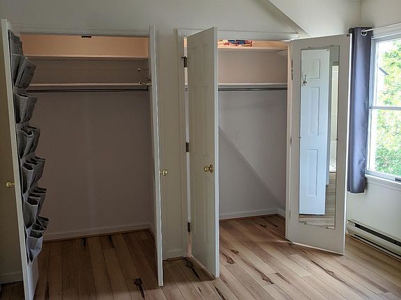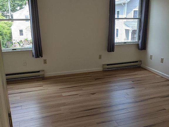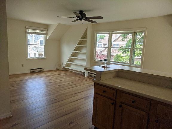 Located in center of town. One bed/bath detached apartment with lots of closets and built-in bookcase. Bedroom is approximately 12 X 14 with double closets. Kitchen has dishwasher and bar counter with enough room for four stools. Bright and clean with lots of windows and sliding glass door to balcony. Laminate wood floors on main level. Large utility room -- washer and dryer included. Private backyard with patio. One-car garage. No smoking. Tenant pays utilities. Electric heat. Landlord takes care of lawn and snow.