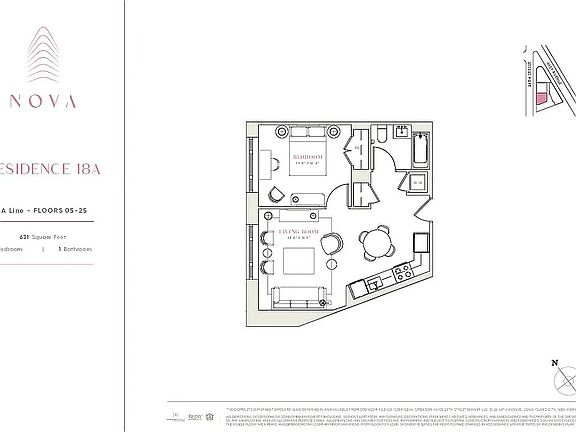 Residence 18A at NOVA LIC offers 631 sq ft of modern living with 10-foot ceilings and oversized west-facing windows framing spectacular Manhattan skyline and sunset views.