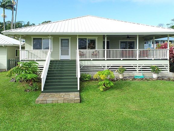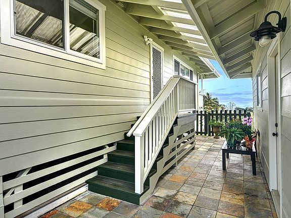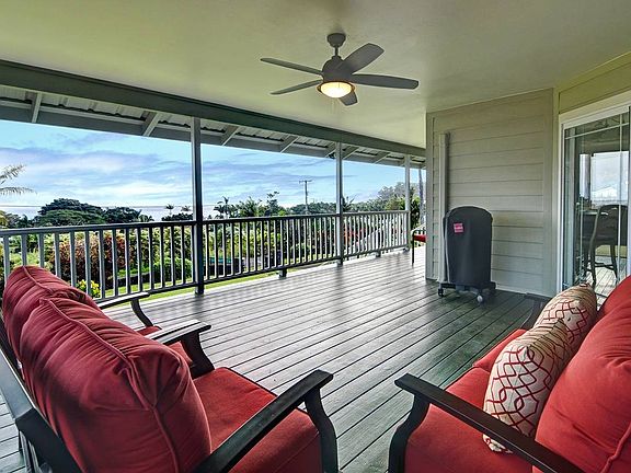 Conveniently located on the Hamakua Coast approximately 20 minutes from down Hilo in the beautiful Hakalau Plantation Village, a sought after and well-established subdivision. This charming 3 bedroom 2 bath home features a large breezy northern facing lanai with sweeping ocean views from the master bedroom, kitchen, and living room. This home boasts curb appeal with the blue lava rock wall and custom remote controlled gate, surrounded by tropical landscaping with palms and fruit trees providing a lush atmosphere and a private paradise, just a short walk from Hakalau Beach Park! Open floor plan with ample natural light, double pane windows and Hunter Douglas window coverings throughout adding a touch of sophistication. Vaulted living room ceiling with ceiling fans including Ductless Carrier A/C throughout. Newer stainless steel appliances, refrigerator/freezer, built in microwave, stove/range and dishwasher with coordinating granite throughout. Spacious bedrooms easily accommodate king size beds, in addition, the master bedroom is a retreat with French doors opening to ocean views and the sounds of crashing waves with large lanai, and plenty of storage with a master walk-in closet. Remodeled Master and 2nd bathroom with new fixtures, coordinating hard wood Maple cabinets, tile and Laticrete grouting, new tub and one-piece Kohler toilets. Remodeled laundry room with coordinating hard wood maple cabinets and granite counter tops with energy efficient newer washer and dryer. The home has a newly installed on demand hot water heater. Large oversized garage with tons of storage and permit application approved to add a future bathroom, in addition a large built in, covered garden shed for yard equipment. Ample parking at the house is a plus! Convenience meets coastal elegance – seize the opportunity to make this beautiful home in Hakalau Plantation Village yours. Sold turnkey, schedule your showing today and embark on a journey to own a piece of paradise!