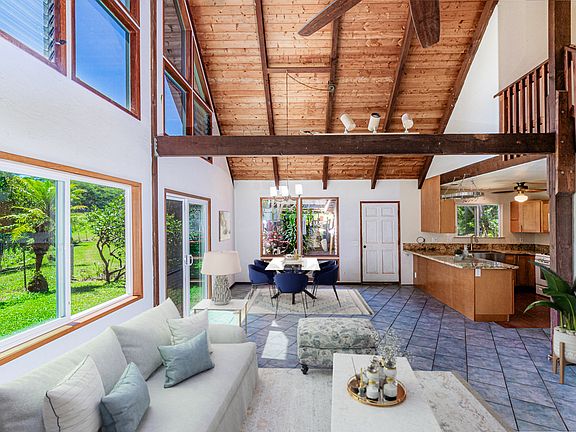 Upstairs, the primary suite features vaulted T&G ceilings, glass garden windows, and a sliding door passage to a large covered lanai. The en suite bathroom includes a vintage claw foot bath and double sinks. Adjacent is a second bedroom and versatile bonus room, previously used for drying coffee beans and ideal for an office or additional bedroom. Attached carport and ample covered storage complete the picture for your vehicles and farm equipment. With some creative touches and TLC, this home has the potential to shine.