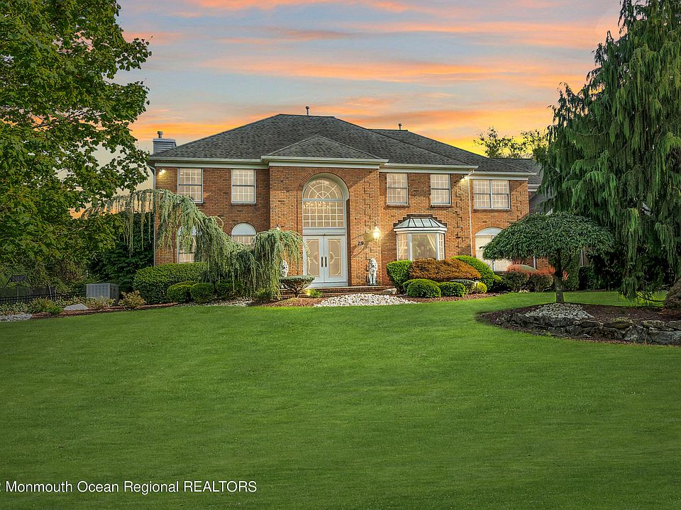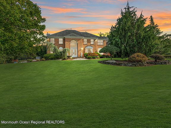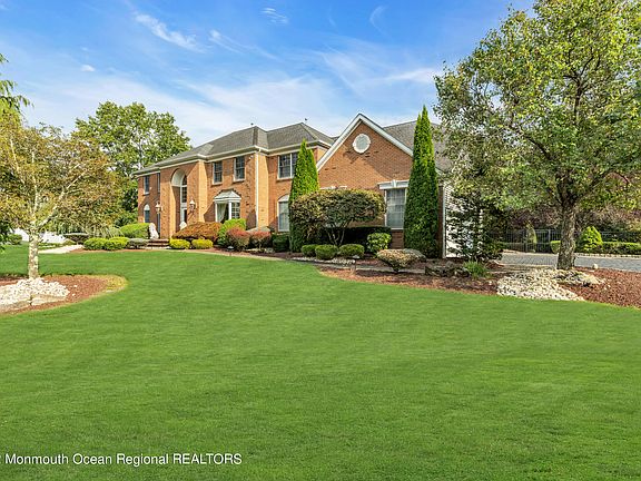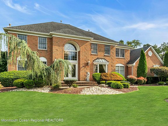 This magnificent colonial-style home set in a peaceful Freehold neighborhood offers everything needed for a tranquil lifestyle. Displaying a stately brick exterior and surrounded by greenery with a paver driveway leading to a 3 car garage. Electric bills are little-to-none with the super-efficient, energy-saving solar system and a backup generator. A handsome staircase in a two-story foyer with an elegant chandelier makes an impressive entry. A chef's kitchen flows openly to the family room and backyard patio. Upstairs boasts a grand primary suite with a sitting area, an elegant room-size closet w/chandelier, a luxurious ensuite plus a bonus room perfect as a workout room or nursery. The resort-style backyard will surely take your breath away with a resurfaced & tiled, heated, inground pool, built in BBQ, fire pit and gazebo in a secluded oasis. Schedule your tour today!