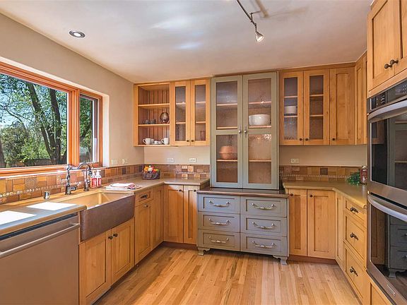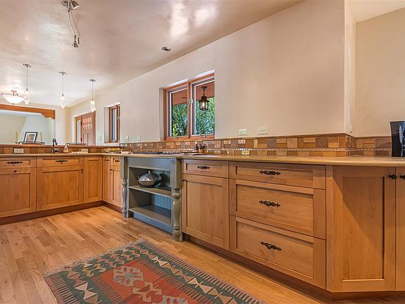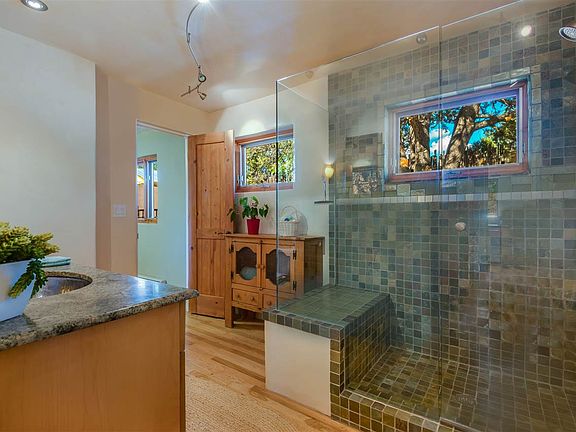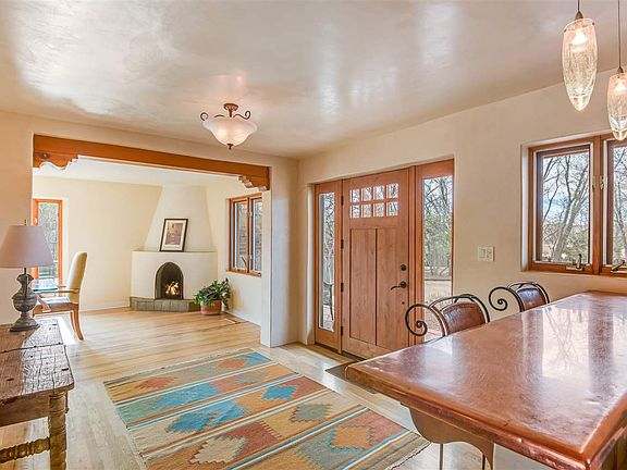 Desirable Tesuque. A wonderfully unique house in a great location! Peaceful, light-filled, mostly adobe home with easy access to nature walks right out your front door. A delightful property that offers access through the arroyo to a charming labyrinth or continue on to the Santa Fe National Forrest & connecting onto the Windsor Trail. Relaxation begins as you start winding up the tree-lined drive and scenic Arroyo Griego to this private, gated and fenced 3 bedroom (or 2 bedroom and an office) 2 bath home, approximately 2800 square feet. Tastefully remodeled, the unusual floor plan has hardwood floors, three kiva fireplaces, beams, vigas, T&G ceilings, chef's kitchen, limestone and copper counter and sinks, custom alder cabinets and recent appliances. There are two steps down to the spacious master bath which offers a double vanity, enclosed glass shower and a claw foot tub. The guest bath features slate and glass tile, a hammered nickel sink and a glass walled shower. The large living room and dining room open through French doors to a gracious patio and deck with views of the Sangre de Cristo mountains and a glimpse of the ski area. This spacious 0.66 acre lot has an acequia running through it with water rights. There is lots of room for gardening, expansion and parking. An additional heated, finished studio space approximately 12'x20' is included in the sq. footage. CNSP equipment for the best WiFi in the area is included. Easy to show and delight to see.