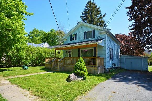 In the lovely village of Moravia, sits this charming, 3 BR, 1.5 BA home. House is laid out very well to feel open & spacious. On main level, the LR opens up to the massive kitchen which has a dining area w/ new flooring. Off the kitchen is laundry room & 1/2 bath. Upstairs opens to an inviting landing, 3 BR & 1 BA. Upstairs HW floors are underneath carpet! 1 BR already has the carpet pulled to reveal the HW floors. Outside is a great, newer wrap around porch & the backyard is huge! Wide paved driveway leads to 1 car garage.