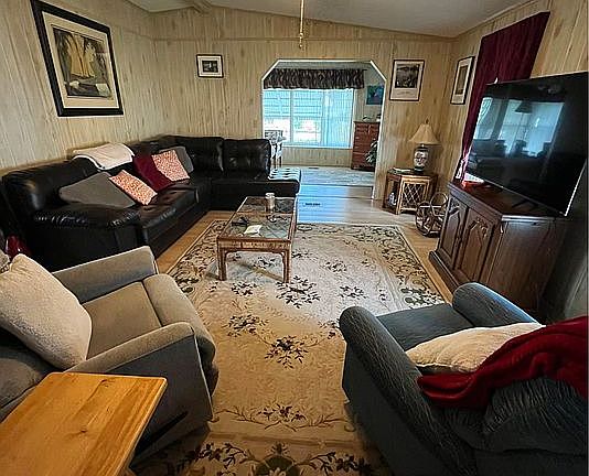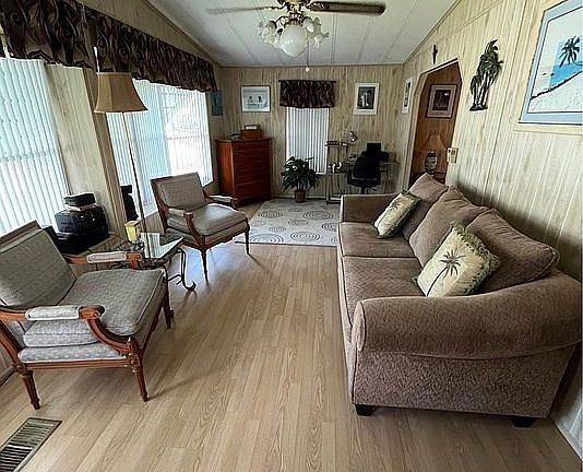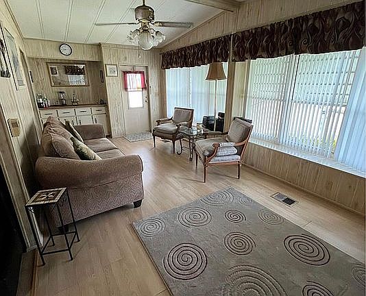 call only if serious for this fully furnished 2br 2ba manufactured home in a 55+ retirement community(Spanish lakes country club) private backyard,new metal roof,updated AC, laminate flooring and tiled bathrooms. Has furnished lanai and a carport with private backyard. All appliances, ceiling fans,AC and heat. Included in your monthly fee is private 9 hole golf course, 2 swimming pools, gym, tennis, pickleball, bocce, shuffleboard, card room and pool tables and many more activities. This house is turn key ready. Just bring your clothes.