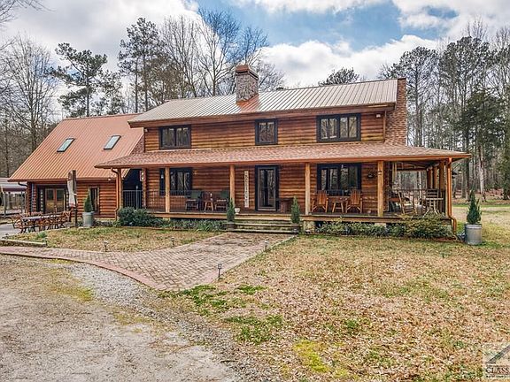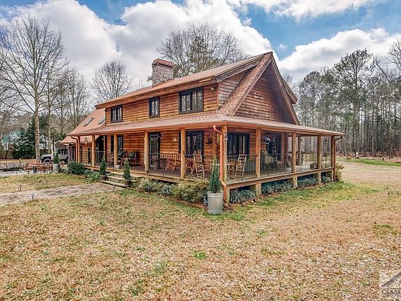 Welcome to the Frost cabin at Barrett Woods, home site of a custom built log home on 4.3 Acres. Setting 300 ft off of a secluded cul-de-sac with a beautiful nature area nestled amongst different species of beautiful maples, evergreens, hardwoods, dogwoods, cedar's, and tulip poplars. Enjoy mornings on the front porch as the sun rises and on the back porch viewing wildlife while the sun sets. Relax on the patio accessible to the kitchen. Play in the newly landscaped open spaced backyard or venture into an area of tall pines on the back side for a fun campsite, and nature trails. During your spare time enjoy projects in the large shop or planning the 2nd level potential apartment/flex area. Then relax in the cool of the evening courtyard amongst tall oaks with fire pit. Enjoy peace and tranquility in your log home with wrap around porch. On the main floor you have 2 large living areas, dining room, kitchen with custom cabinetry, dark walnut flooring and countertops, open shelving, stainless steel appliances, laundry, and a half bath. The beautiful spiral staircase leads you upstairs where you'll find vaulted ceilings of tongue & groove pine, 4 bedrooms and 3 additional baths. This home offers so much for you and your family. You also have the choice of either Social Circle or Walnut Grove School school district.
