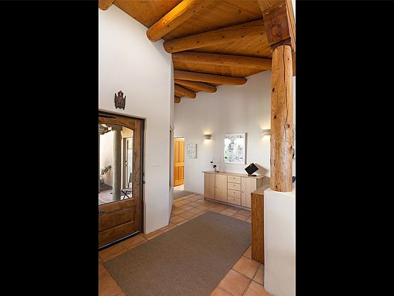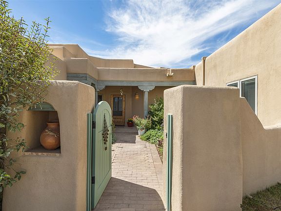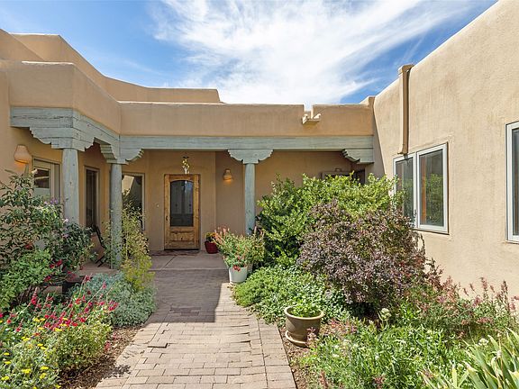 High desert sanctuary. Enjoy spectacular sunsets and dramatic mountain views from this 2453 square foot soft contemporary pueblo-style home. Enter through a colorful and lush courtyard into an elegant foyer and spacious, light-filled living/dining area with tiled floors, fireplace, and high ceilings with vigas. The large, updated eat-in kitchen features slab granite counter tops and an island, slide-out cupboard shelving, stainless steel appliances and pantry. Both the kitchen and the great room share stunning views and access to the portal that opens out to the high desert landscape and vistas of the Ortiz, Sandia, and Jemez mountains, creating an inviting space for hosting family and friends. The owner’s bedroom has tile floors and a private, tree-shaded courtyard. A large bathroom completes the owner’s suite with a jetted tub, separate shower, water closet, double sinks, and a generous walk-in closet which includes one of the home’s 19 skylights. Two additional bedrooms and a full bath are accessed from a hallway with an entrance from the front courtyard. At the other side of the house is a library or office space, also with access from the front courtyard, and a third garage bay or art studio plus an approximately 700 sq ft finished over-sized two car garage. Off the kitchen, the convenient laundry room has plenty of cabinets, a large closet and a sink. The gas-fired in-floor radiant heating and the four mini-split units for cooling and additional heating ensure comfortable living year-round. Another lovely feature of this 1.21 acre property are the mature aspens, pines and other shade trees. The home, which was reroofed in 2019, is located only two doors off-pavement and is adjacent to the Rail Trail which runs between Lamy Village and Santa Fe proper, offering miles of hiking and biking.