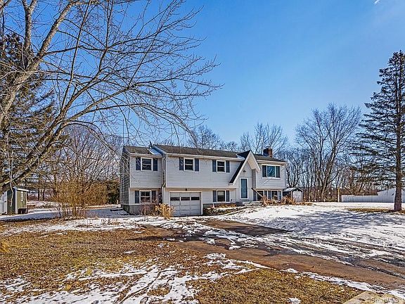 Enjoy this fabulous 3-bedroom, 2 bath spacious raised ranch situated on a private .69-acre flat lot in a desirable neighborhood setting. Built in 1974 this home is sure to meet all your needs with 1,606 total sqft. of finished living area, a 1 car garage, workshop and shed for storing yard equipment/other items. The Split-level room layout leaves communal areas open and connected while keeping private rooms sequestered and cozy. The expansive living room has a lovely large front window and extends into the dining room. Sliders from the large eat-in kitchen room take you to a deck overlooking a sprawling yard with an expansive lawn, perfect for all your outdoor entertaining. The eat-in kitchen has an abundant number of cabinets for all your cooking needs. The spacious master bedroom features a full bath, walk-in closet, and private office. Two more amble sized bedrooms and a shared hall full bath complete the main level. Step downstairs to a spacious family room with w/a coal fireplace & laundry access. Special features/amenities include: upgraded energy efficient windows, newer refrigerator, basement workshop, coal/wood stove. This home is conveniently located just minutes from Ellington Middle and High Schools, parks & shopping Don't miss out on this opportunity