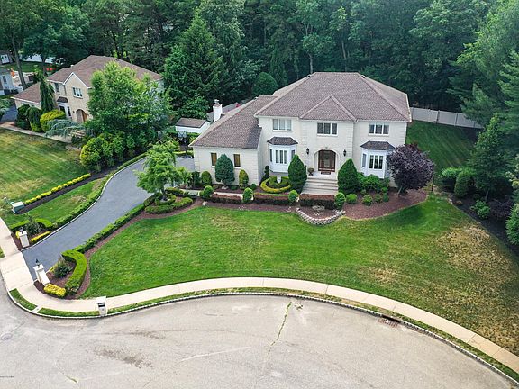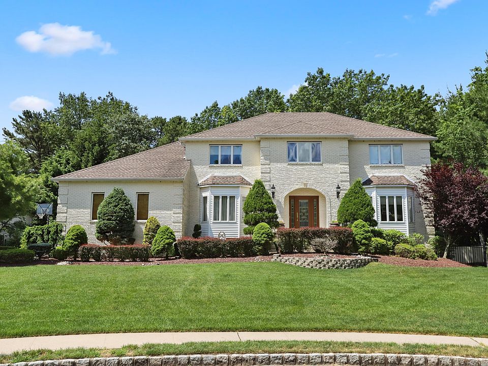 Located on a quiet cul-de-sac in desired Morganville, this stately brick front colonial is meticulously maintained. Step into the impressive two-story center hall foyer w/gorgeous 10'' decorative moldings & crowned thresholds. Foyer, living, & dining rooms all have elegant porcelain floors. Family room has vaulted ceiling w/skylights drenched with light, hardwood floor, & is open to kitchen. Newer kitchen has custom cabinets, tile backsplash, Viking refrigerator & counter top range, Wolf double oven, center island with seating for two, granite counter tops, built in microwave, wine cooler fridge, and ceramic tile floor. The breakfast nook with table & cozy built-in bench on a bay window that views the rear private resort-like yard. Slider leads to the amazing covered raised paver stone