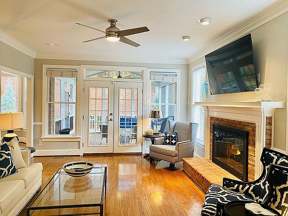 • RoomLivingRoomFeatures: Fireplace, French Doors, Floors-Hardwood, Molding, Ceiling Fan, Recessed Lights