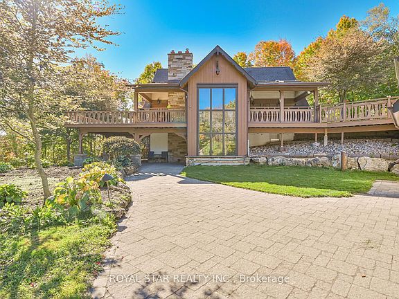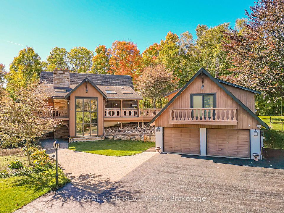 This unique, custom-built home sits on 2.63 acres of offering a perfect mix of tranquility, natural beauty and well landscaped. The property features rolling and level terrain, a peaceful woodlot with wildlife, mature trees, perennial gardens, stone patios, walkways, and an inviting in-ground pool. Multiple private decks, some covered with roofs and awnings. Inside, large windows and glass doors fill the spacious tow and a half level home with natural light, highlighting features such as a cathedral-beamed media room, a well-equipped kitchen, and multiple fireplaces. A private guest suite above the detached two-car garage adds comfort and versatility. Ideally located just minutes from skiing, fishing, golf, hiking & Only 30 mins to Pearson Airport.