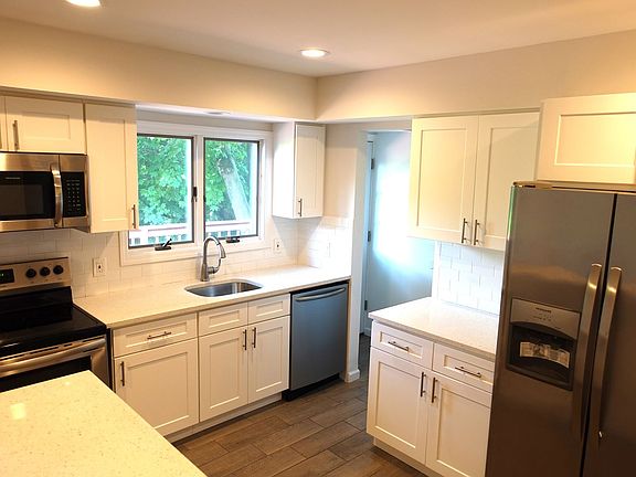 Welcome to this beautifully updated 3 bedroom, 1 bath home! Enter into the living room / dining room area that features a wood burning fireplace and scenic picture window that connects to the new kitchen boasting a full compliment of stainless steel appliances, quartz countertops and a breakfast bar looking out over the deck and back yard with mature trees. The additional sunroom has vaulted ceilings, large windows and a sliding glass door out to the rear deck that provides a relaxing place to unwind or entertain, The updated full bath features beautiful marble tile and all new bath fixtures. Other features include: Central A/C, hardwood floors, washer & dryer, 1 car garage, full basement. landscaping included, pet friendly with approval Minimum Requirements: 5 person max occupancy, No Smoking on premises, credit score of 675 or better, combined minimum income of 140k per year. Call today!