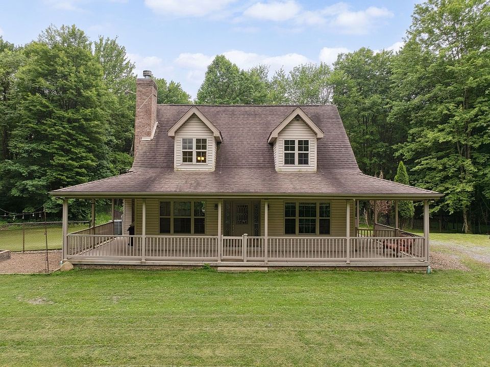 Nestled on 7.4 acres, this spacious colonial features 2 bedrooms, 2 full baths, a wrap-around porch, unfinished basement with high ceilings and tons of potential. First floor primary suite and laundry for one floor living. Other highlights include an outdoor wood stove for heat and hot water in the winter, a reverse osmosis system, an outdoor area turfed and fenced for dogs, and a 2-car detached garage with 3 dog kennels and a large storage loft.
