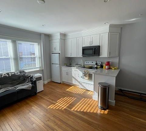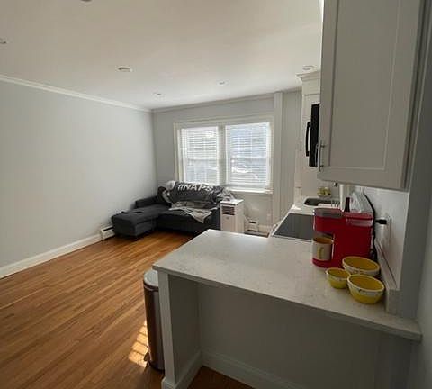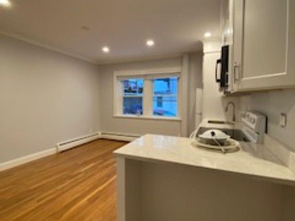 Large two room studio featuring hardwood floors, updated kitchen and bath with oversized shower stall. Walking distance to train, busses, Main St. and Moody St. Storage unit included in basement. Cat friendly, no dogs. Hot water included. Nonsmoking interior. 1 car parking only (must be a smaller car). Perfect apartment for 1 occupant.