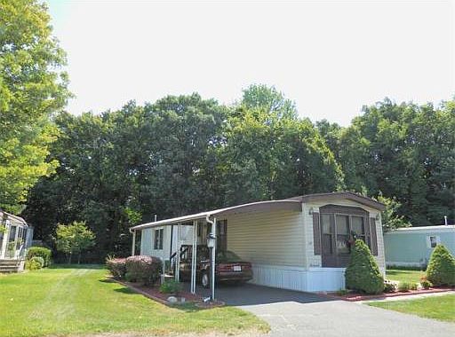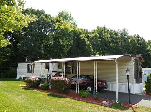 Everything is here and waiting for you! This lovely 2-Bedroom Double Wide Mobile Home, located in a desirable 55+ community, offers a spacious open layout w/Large Living Room w/Cathedral Ceilings open to Eat-In Kitchen w/Ample Cabinets & Countertop Space and Formal Dining Room w/Built-In Cabinets. Two great size Bedrooms with good size Closet Space, Guest Full Bathroom and Master Bathroom w/Jet Tub, Stall Shower and Double Sink Vanity. Easy one-floor living w/Carport, Covered Deck, Gas Heat, Central Air and Storage Shed.