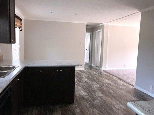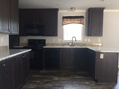 Bright marble look counter tops, with dark cabinets, wood look vinyl flooring throughout kitchen & dinning room area makes this spectacular open floor model perfect for family and friends entertainment.