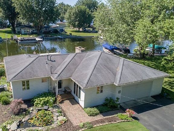 Lovely home with open floor plan within sight of lake on 120 ft of extra wide, deep channel with large concrete seawall with 2 vinyl piers. Large windows on channel side, along with large 10 x 34 ft. wood deck. Huge master bedroom with large slider going to deck . Master bedroom has a private bath with solid surface counter top and walk-in closet. Lovely wood floor, granite counter top in kitchen with stainless steel appliances. Quartz counter top in main bath located by other 2 bedrooms. Sun room, small pond by roadside door. On demand water softener, 96% furnace, 17 seer a/c. Newer carpet. Also has a private ramp use by neighborhood.