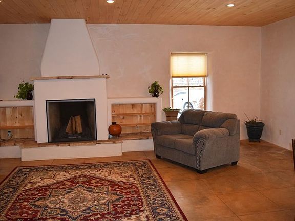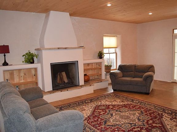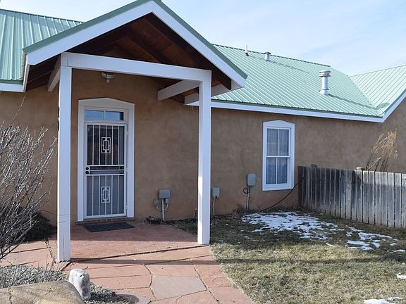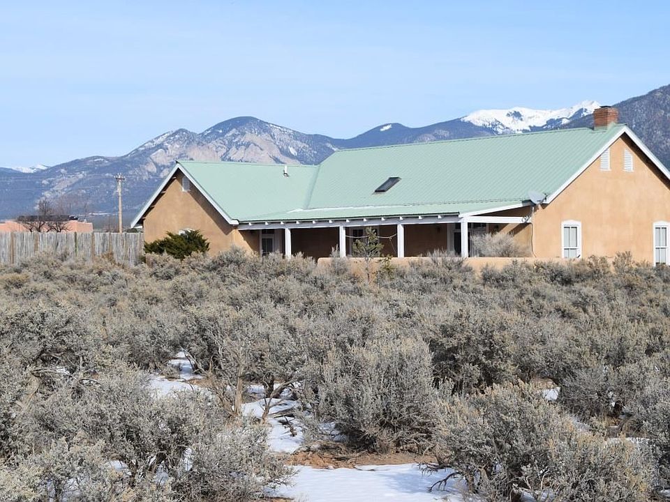 2000 custom build home has amazing mountain and sunset views. This territorial style 2,160 square foot home features 3 bedrooms and 1 bath. The open living, kitchen and dining area invite you in. Abundant natural light, high ceiling in living/kitchen area and fireplace create that welcoming ambience. Concrete floors and countertops. Access from the living/dining area to a covered patio offer a great space for entertaining. Sit and relax while taking in the sunsets. 1 car garage, well, septic, natural gas on 1.336 acres. Convenient access to Town and Taos Ski Valley.