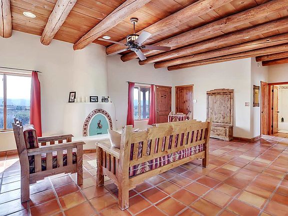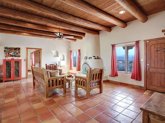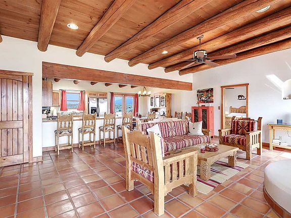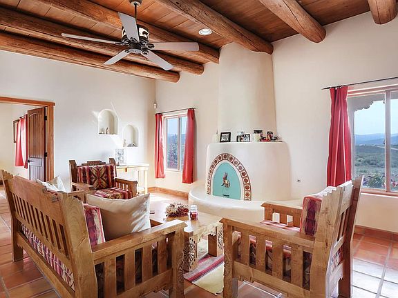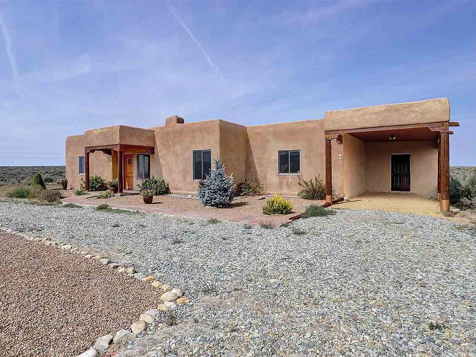 Impeccably maintained 3BD/2BA pueblo style home, featuring saltillo tile and vigas throughout. Cozy up to the gas-log fireplace in the open living area. Cooking is a breeze in the functional kitchen, with upgraded cabinets and granite tile countertops. Relax and enjoy the outdoors in the walled back patio. Enjoy mountain and sunset views from your 2 acre slice of paradise. This is the quintessential Taos home for which you've been searching!