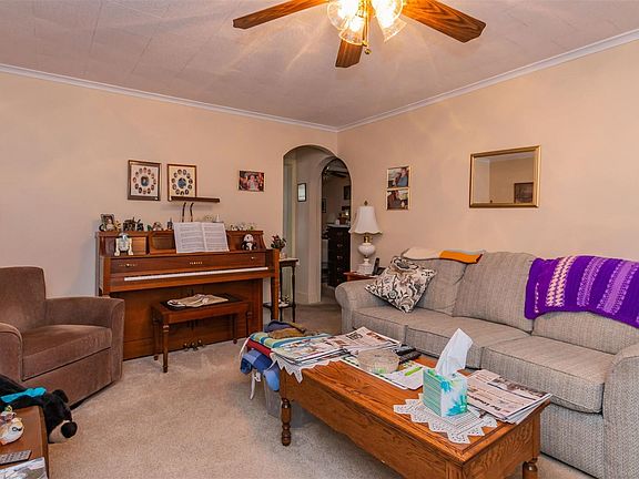 Beautiful well maintained 4 bedroom Cape cod with updated metal roof, vinyl siding,replacement windows, funace, electric and HW heater. Full bath w/2 bedrooms on 1st floor and 2 bedrooms on 2nd. Eat in kitchen, livingroom w/fireplace and yr round heated sun porch. Full basement with laundry and toilet area. Oversized 2 car garage with electricity and work shop. Conveniently located near Hospital and Country Club. All that's left to do is move in. Sheds are not included