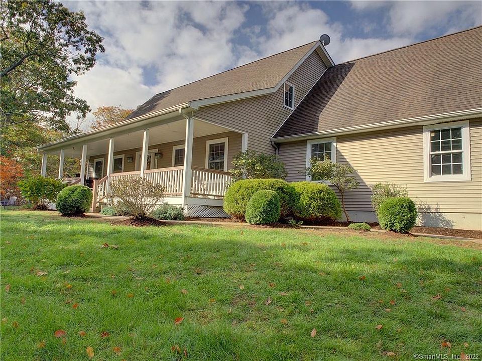 Custom built 3 BR, 3 bath Cape Cod located at the end of a cul-de-sac in Gales Ferry offers a farmers front porch, open floor plan with living room w/ vaulted ceiling & gas fireplace, spacious kitchen with gas cooktop, wall oven and stainless steel appliances, office/den with French doors and dining room with slider to deck that leads to an above ground, heated pool. Upstairs family room, primary suite with full bath, whirlpool tub and walk-in closet, two finished rooms in the lower level, hydro air, CENTRAL AIR & two car garage. Located within mins of Subase, Electric Boat & Coast Guard Academy.