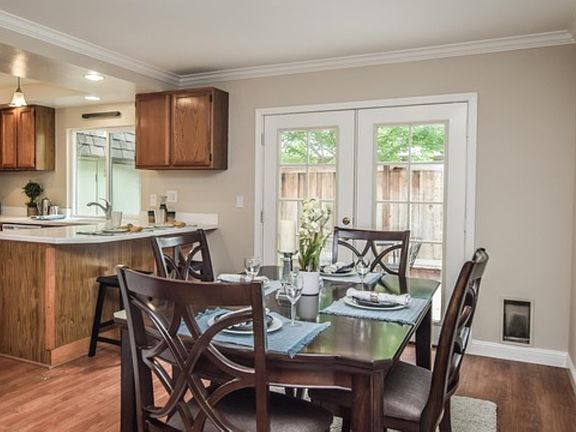 This 3 bedroom, 1 and 1/2 bath townhome measures approximately 1276 sq ft. The end unit location provides an abundance of light and privacy. Entering through the front door leads to a large living room with attached dining room . The living room is flooded with light from the sunny window with custom shutters. The dining room has French doors that lead out the private fully fenced rear patio. Large closets on the rear patio provide ample space for storage. Solid surface counters, a gas stove and built in microwave are some of the features in the updated kitchen. A full size washer and dryer are conveniently tucked into the laundry area adjacent to the kitchen. A remodeled half bath completes the first floor. Three spacious bedrooms are located on the second level. The largest featuring mirrored closet doors. The second bedroom has ample closets and custom built ins. The main bathroom on the second level is completely remodeled as well. The Fountainhead complex has a large swimming pool and ample green belt areas. Access to 680 and highway 4 make for easy commuting from this convenient location.