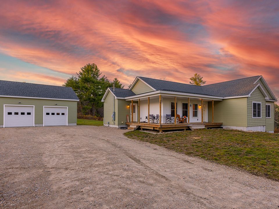 Recently built in 2023, this single floor living 3 bedroom 2.5 bathroom ranch sits on over 5 acres and includes a detached 2 car garage. Set back from the road with open fields and plenty of space ideal for solar, the property offers a peaceful rural feel while still having the convenience of town water. The detached 2 car garage has high ceilings and a reinforced concrete floor. The home has a large back deck that extends from both the kitchen and dining area and the primary bedroom, creating a great space to relax and enjoy the surroundings. Inside, the layout is bright and open with a spacious kitchen, dining area, and living room. The primary bedroom features a full bath and walk-in closet, and the other two additional bedrooms also include walk-in closets. Laundry is located on the main floor near the kitchen and ½ bathroom for everyday convenience. The walk-out basement is already plumbed for a second kitchen and bathroom, offering future potential for an in-law setup or additional finished space. The home is heated with a forced hot air heat pump/ propane system and includes central air and propane on demand hot water. A comfortable setting with room to grow and enjoy. Open House this Saturday, Nov 8th from 11am to 12:30pm