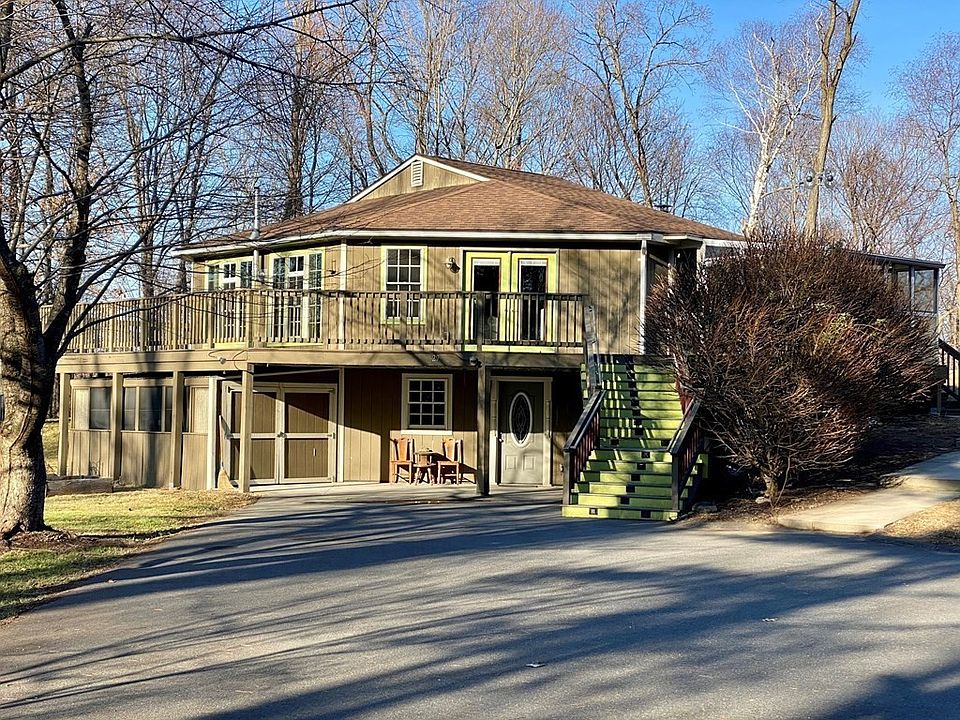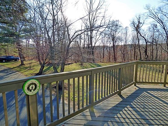 Tranquility awaits you in this updated 2-story contemporary home. Hilltop, off-road location on 2.5 acres adjacent to bike path offers seasonal CT River views. Access main upper level via lit Trex staircase to wrap around deck, overlooking beautiful landscaped yard, raised garden beds, stone firepit/patio, and wisteria arbor. Foyer with parquet floor leads to sunny living room, where pellet stove and AC offer year round comfort. Cook's eat-in kitchen is accented with gorgeous granite countertops, storage island, appliances, and laundry area. Or dine on adjacent screen porch. Spacious MBR has tiled private bath, huge walk in closet, and French doors to deck. 2 more rooms with large closets and 2nd full bath. Hardwood floors and built-ins throughout. Ground-level first floor could be in-law apt, w/large kitchen, full bath, 2nd pellet stove, family room, laundry, and 2 bonus rooms. OR access via inner stairs to double your living space! Five minutes to Greenfield, yet feels miles away!
