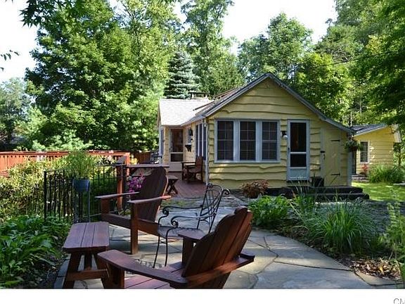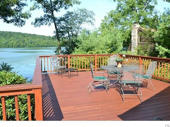 PARADISE FOUND, one of a kind, private setting western exposure with wide lake views and level frontage. Relax and enjoy the expansive outdoor entertaining areas, large bluestone patio with built-in grill, sprawling decking, fieldstone stairs and walkways. The main house is cozy with charm and character, updated kitchen w/granite and updated bath, living room has a warm stone fireplace, master with sliders to deck and views. The waterfront has a Cantilevered dock, fieldstone steps to shaded sandy swimming area. yard fieldstone walls. Separate guest house has a full bath, living room and bedroom, separate electric. Updated 3 bedroom septic, in rear offers expansion potential. New Roof and windows. House is on piers. Call for details.