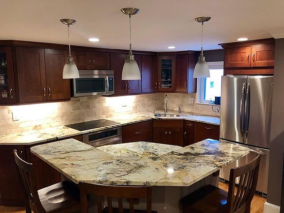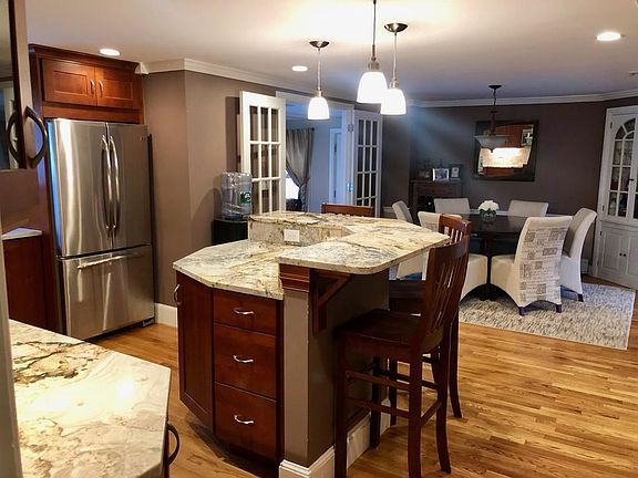 - Kit Dscrp: Dining Area, Flooring - Hardwood, Countertops - Stone/Granite/Solid, Cabinets - Upgraded, Kitchen Island, Stainless Steel Appliances, Open Floor Plan, Recessed Lighting, Remodeled, Lighting - Pendant, Crown Molding