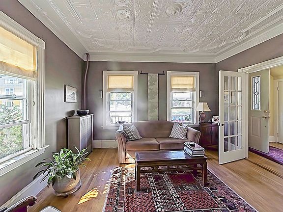 Discover the charm of this captivating home that exudes character & comfort. This attractive property was once a HOLIDAY HOUSE TOUR feature. The first floor's genuine TIN CEILINGS, elegant CROWN MOLDINGS, FRENCH DOORS & HARDWOOD FLOORS, offer a delightful blend of classic architecture & modern living. The living room welcomes you with its impressive high ceiling & interior columns & opens to the dining room w pocket doors & a BUILT-IN BUFFET. The updated kitchen serves as a central gathering place, featuring a large kitchen island, a VIKING gas stove/cooktop & side pantry space w coffee station, creating a warm and inviting ambiance for culinary exploration. The bathroom provides a sanctuary, featuring a stained glass window, wood wainscoting & luxurious soaking tub. The 2nd floor's sitting area leads to the hallway w three bedrooms, all w hardwood floors. The meticulous landscaping flows to a covered patio & a cozy 'he/she-shed' equipped w a wood burning stove, TV hookup & storage.