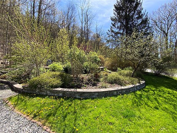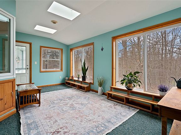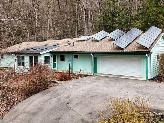 Tucked back and surrounded by nature, enjoy this one-level, energy-efficient 3-bedroom, 2-full-bath contemporary home in beautiful Ellis Highlands.  Inside, this open-concept design provides a multitude of space, defined by a central two-sided brick fireplace with both gas and pellet stoves. This easy-flowing layout effortlessly combines dining, living, and family rooms, all filled w. natural light from picture windows & large skylights. A spacious eat-in kitchen w/ plenty of cupboards and counter seating makes a nice spot to gather. The primary bedroom provides double closets and interior access to an updated full bath with a soaking tub. 2 additional bedrooms w/ new carpet, paint, & closets. A large laundry room, walk-in pantry, storage room, and an additional full bath round out this unique floor plan. Offset your costs with a rooftop array of solar panels with power backup system and a garage wired for two car chargers. Don't forget the bright & cheery four-season sunroom for all of your plants & starters, while the private back deck is surrounded by tiered garden beds. This magical home has it all.