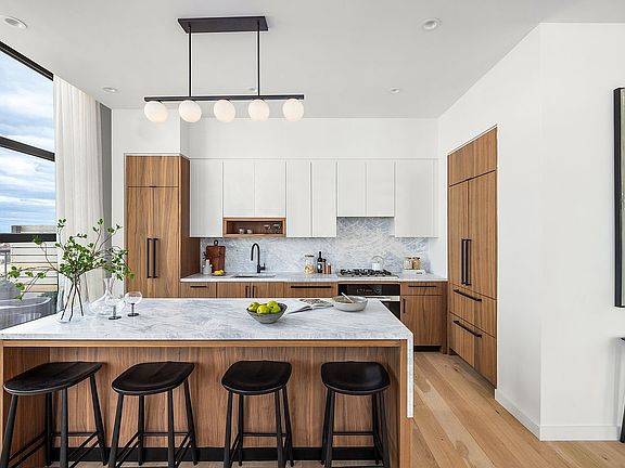 A tasteful foyer with a reach-in closet flows into an open-plan living room, dining room, and kitchen saturated with northern and eastern light. The space leads out to a large balcony perfect for sun lounging, alfresco dining, and more. The kitchen juxtaposes honed Italian Dolit marble slabs with custom made, imported two-tone cabinets and drawers. It features a huge eat-in island and a full suite of integrated Miele appliances. The king-size primary suite boasts a walk-in closet, a reach-in closet, and a stylish en-suite bathroom with a windowed glass-enclosed walk-in Signature rain shower. The second bedroom has a reach-in closet and sits across from a second full bathroom. A Bosch washer and dryer completes the home.